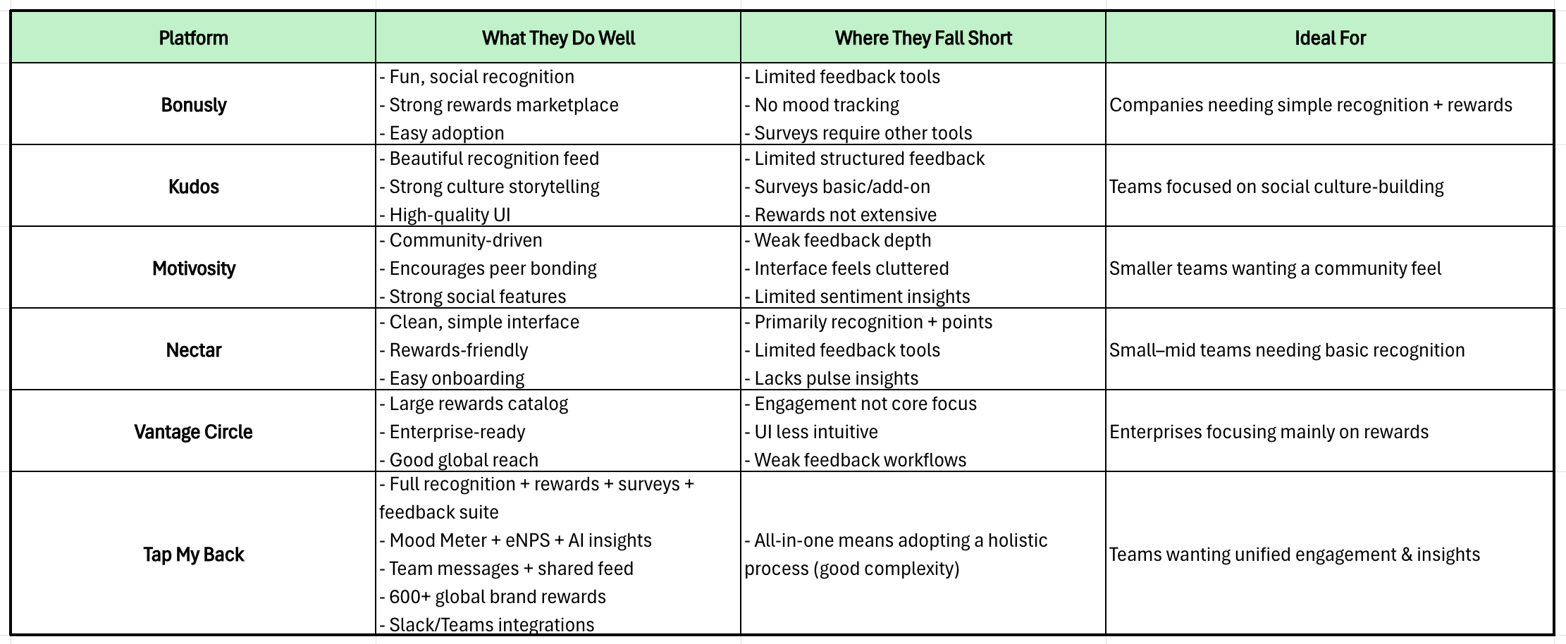 And in a market where Bonusly, Kudos, Motivosity, Nectar, Vantage Circle and others promise the world, the truth is simpler:
